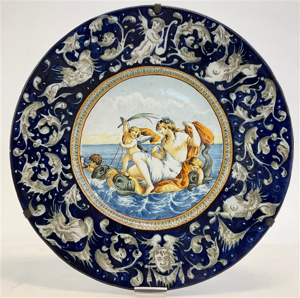 Piatto decorativo in ceramica policroma raffigurante il trionfo di Galatea con