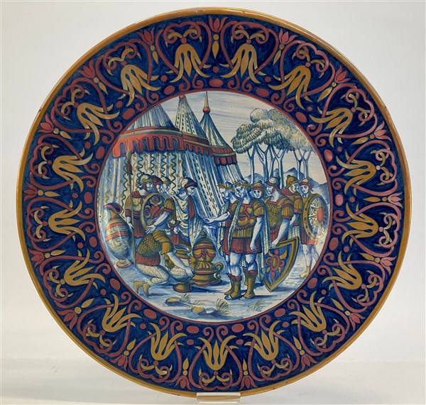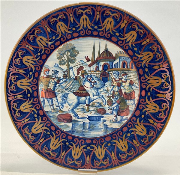Ignoto, coppia di piatti istoriati con personaggi dell'Impero romano in ceramica policroma, dedica al verso datata luglio 1909 (d cm 44) (lievi difetti)