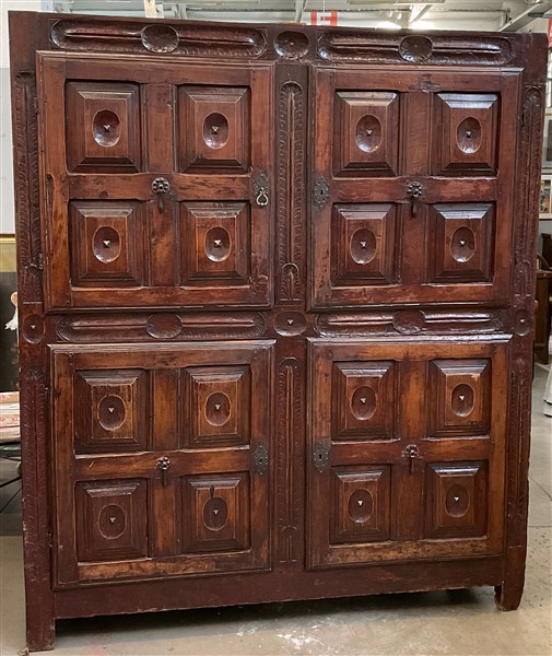 Antico mobile a quattro ante riquadrate e pannellate, fasce e montanti intagliati a motivi vegetali stilizzati (cm 160x84x60) (difetti)