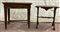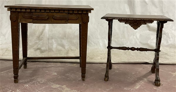 Lotto composto da due tavolini in legno intagliato con gambe riunite da travers