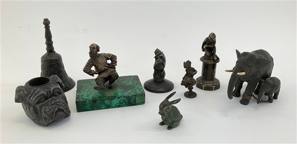 Lotto composto da un calamaio e un campanello in bronzo e cinque piccole sculture di soggetti differenti fra cui un ballerino su base in malachite, e una scultura in metallo brunito raffigurante elefanti (h max cm 13) (difetti)