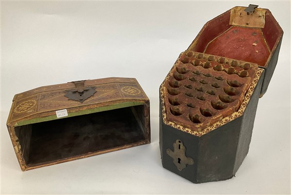 Lotto composto da due scatole portaposate rivestite in pelle di diverse epoche e decoro (difetti)