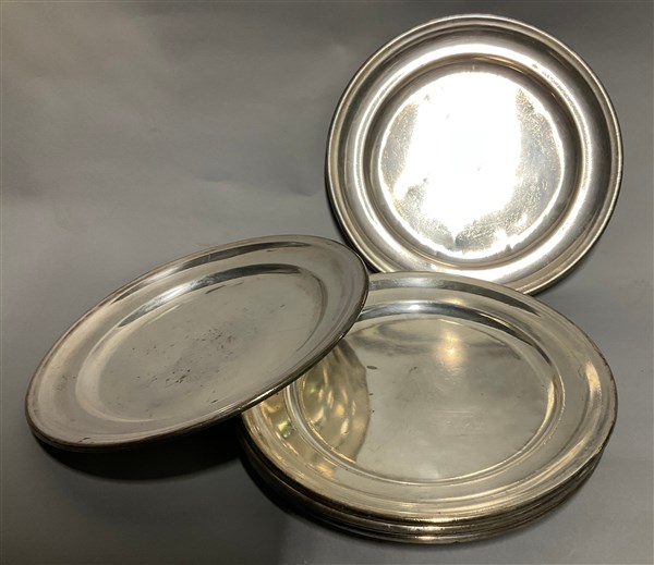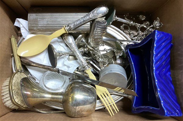 Lotto ocmposto da sei vassoi tondi, numerose posate e oggetti diversi in metallo argentato (difetti)