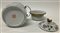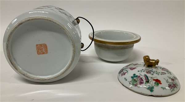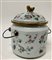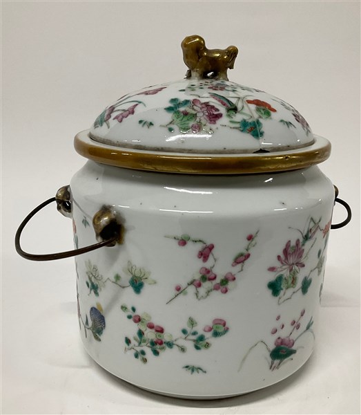 Portariso biansato con coperchio in porcellana decorata in policromia a fiori e insetti