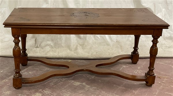 Tavolo da salotto di forma rettangolare con quattro gambe tornite riunite da traverse (cm 136x60x60) (difetti)