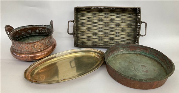 Lotto composto da un vaso e un sottovaso in rame, un vassoio ovale in metallo argentato e uno biasanto simulante un cesto (difetti)