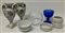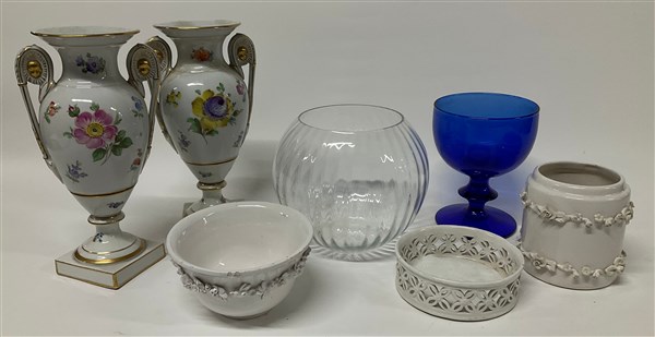 Lotto composto da una coppia di vasi biansati in porcellana decorata a fiori, un sottobottiglia e quattro vasi differenti in ceramica e vetro (difetti e restauri)