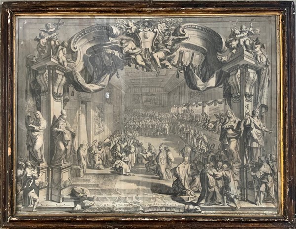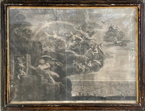Lotto composto da due incisioni intelate di autori e soggetti diversi del secolo XVIII, in cornici antiche in legno laccato (difetti)