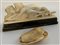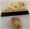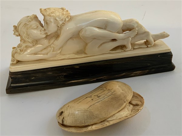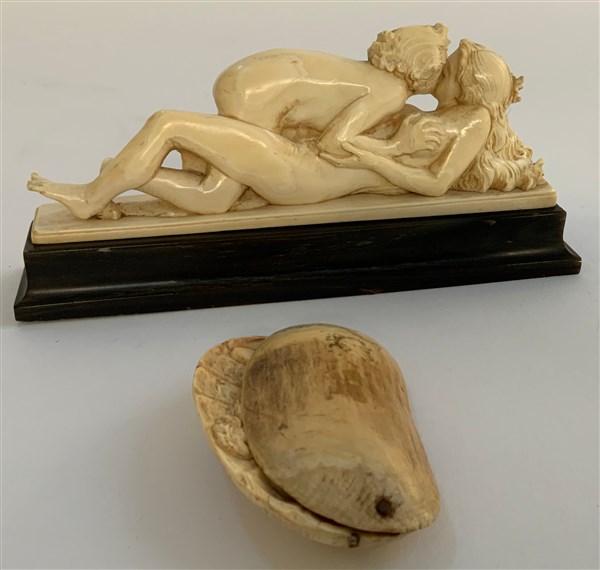 Lotto composto da una scultura in osso su base in corno raffigurante una coppia sdraiata (cm 19x8,5x5) e un manufatto in osso a forma di sasso con interni intagliati a scene erotiche (cm 8x5) (lievi difetti)