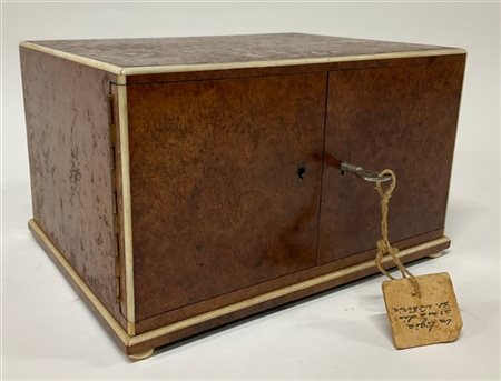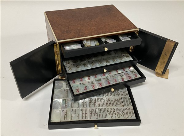 Scatola lastronata e profilata in avorio contenente gioco del mahjong con tesse