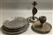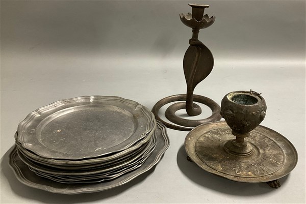 Lotto composto da un candeliere in metallo cesellato a forma di cobra, un calamaio in metallo mancante del coperchio decorato da figure in bassorilievo e dodici piatti in peltro (difetti)