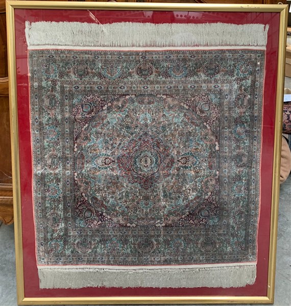 Tappeto Qum, probabile manifattura cinese, secolo XX. Annodato in seta su ordito e trama in seta. Decoro floreale policromo con piccolo medaglione polilobato su fondo bianco arricchito da numerosi oggetti ed animali (cm 102x92) (difetti)