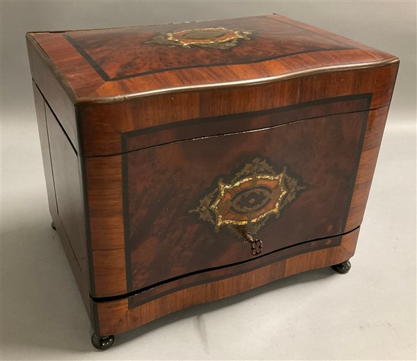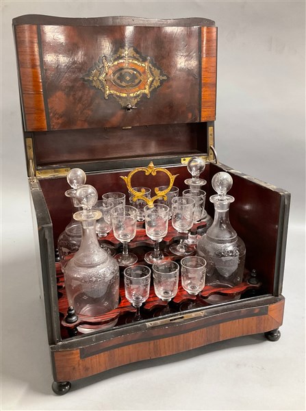 Servizio da liquori contenuto in una scatola in legno intagliato, filettato e intarsiato in metallo e madreperla, composto da quattro bottiglie e undici bicchierini in cristallo inciso (cm 33x26x24) (difetti e mancanze)