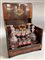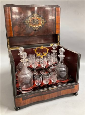 Servizio da liquori contenuto in una scatola in legno intagliato, filettato e i