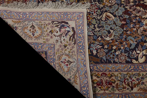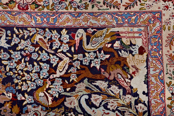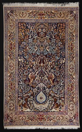 Tappeto Isphan, Persia, metà secolo XX. Annodato in lana e seta con orditi in seta. Decoro con "giardino dell'Eden" ricco di alberi fioriti, mazzi di fiori e volatili su campo blu notte. Alla base un ornamento tipico delle corone imperiali dello Scià di Persia. Bordura con volatili e rami fioriti su fondo camoscio (cm 244x154) (lievi difetti)
