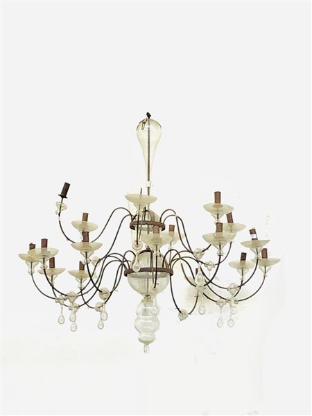 * Lampadario a diciotto luci su due ordini in ferro battuto e vetro soffiato, bracci ricurvi e pendagli. Murano, secolo XIX (h cm 120) (difetti e manzanze)