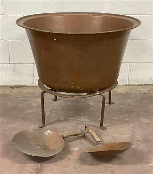 * Lotto composto da un grande calderone in rame con supporto tripode in ferro e