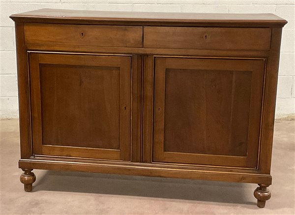 Credenza in noce con due cassetti sottopiano, due ante riquadrate e piedi anteriori torniti, secolo XIX (cm 150x105x56) (gravi difetti)