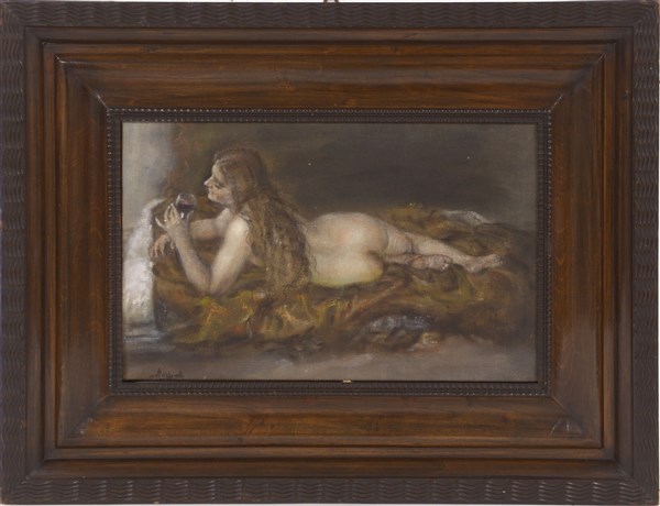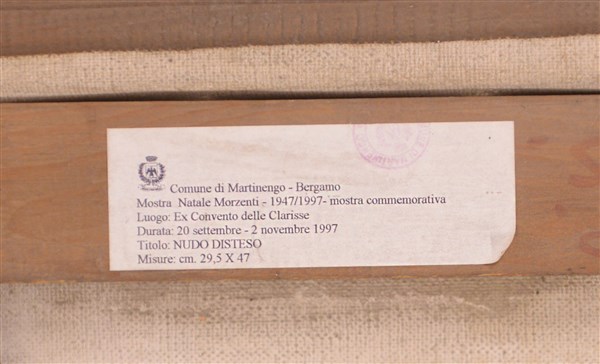 "Nudo disteso" olio su tela (cm 29.5x47) Firmato in basso a sinistra. Al retro: timbro e cartiglio della Mostra Commemorativa Natale Morzenti 1947/1997, Martinengo 20 settembre - 2 novembre 1997. In cornice
