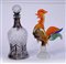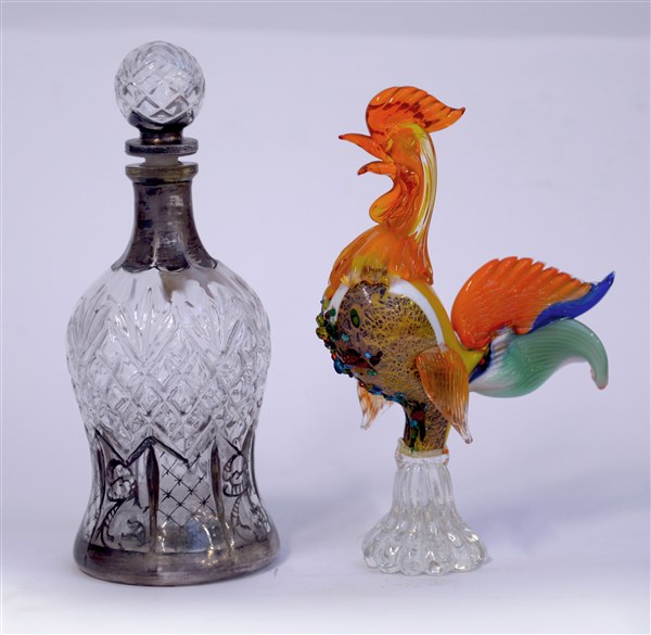 Lotto composto da una sculturina in vetro policromo raffigurante un gallo unita a una bottiglia / carillon con tappo in cristallo molato decorata con motivi argentati. Italia, secolo XX. (misure diverse) (lievi difetti)
