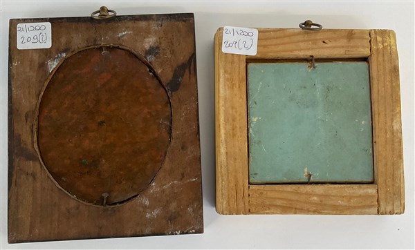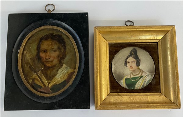 Lotto composto da una miniatura su rame e una su avorio raffiguranti popolana e gentildonna (misure diverse) (difetti)