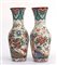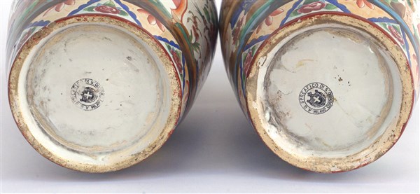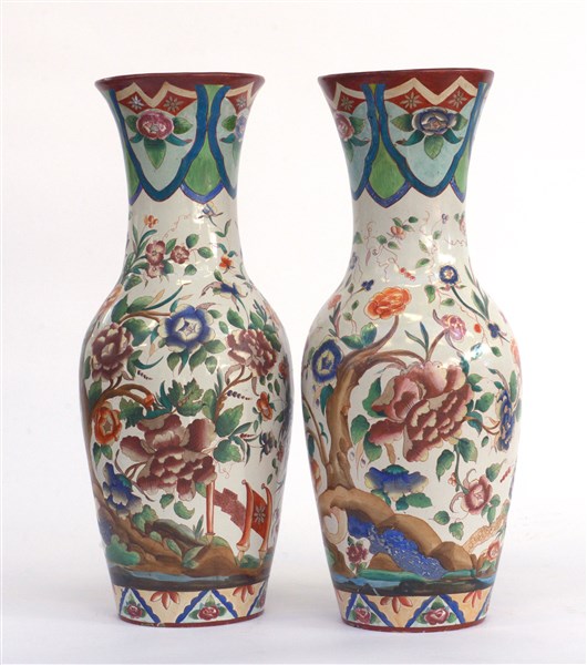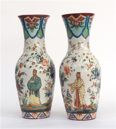 Manifattura della fine del secolo XIX , Coppia di vasi in ceramica decorata in policromia a motivi orientali (h cm 42) alla base timbro "A.G. Spreafico, Milano, Cordusio" (difetti)
