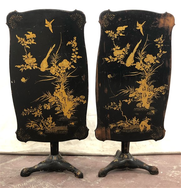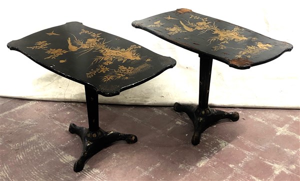 Coppia di tavolini a vela in legno ebanizzato decorato a dorature a rami fioriti con volatili. Gambe rastremate, terminanti a tre piedi. Secolo XIX (cm 77x54x44) (difetti)