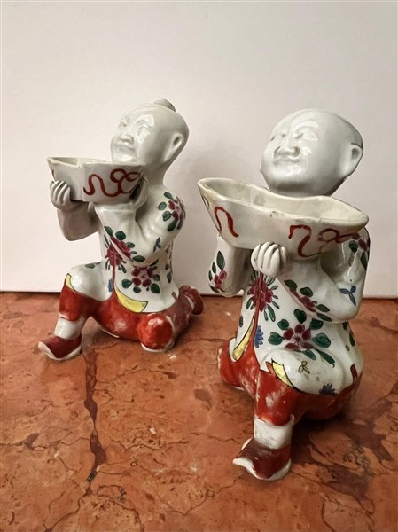 Coppia di sculture in porcellana policroma raffiguranti figura di cinese inginocchiato che sorregge vasca (h cm 15) (difetti e restauri)