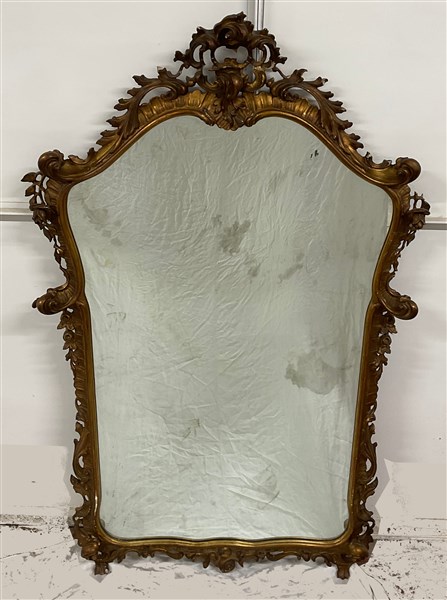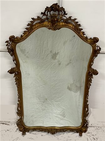 Specchiera di forma mossa in legno intagliato a volute fogliate e fiori, cimasa traforata. Secolo XVIII (cm 102x160) (dfetti e restauri)