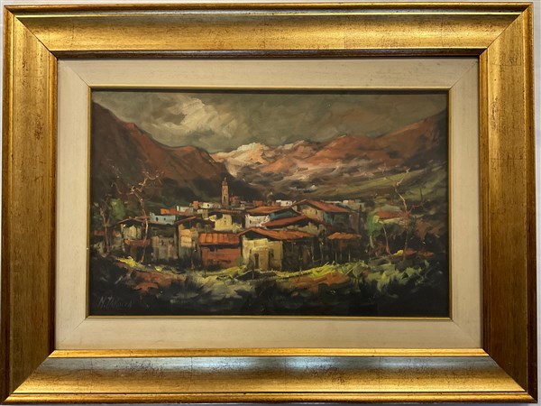 "Paese di montagna" olio su tela (cm 35x56) Firmato in basso a sinistra. In cornice