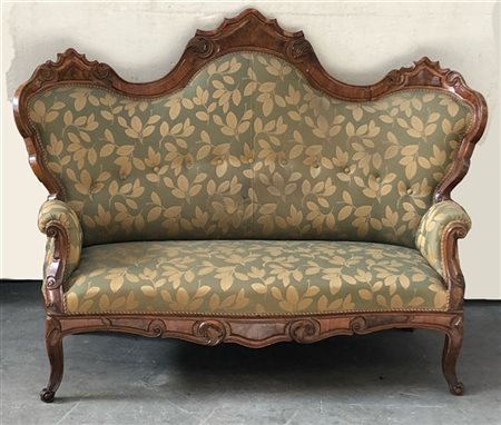 Divano a tre posti di forma mossa in legno intagliato, seduta e schienale imbottiti con rivestimento in tessuto a motivi fogliacei, secolo XIX (difetti)