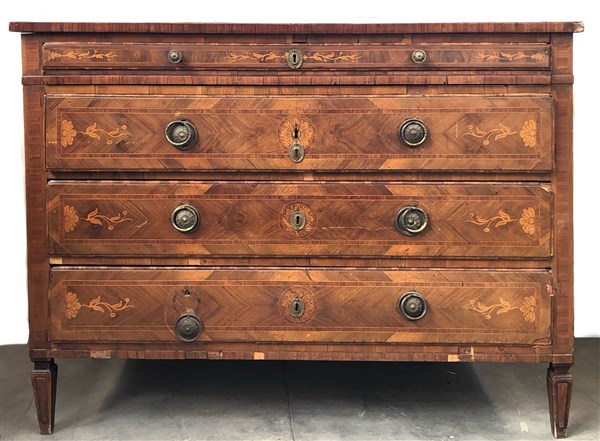 Cassettone a tre cassetti più uno piccolo sottopiano in legno lastronato, filettato e intarsiato in legni vari. Piedi rastremati, secolo XVIII (cm 130x97x60) (difetti e mancanze)