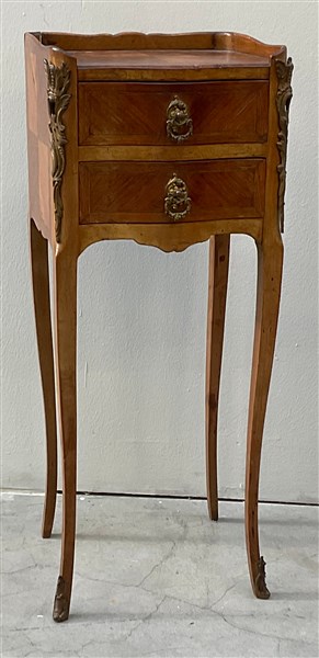 Comodino da centro di forma mossa lastronato a due cassetti decorata con guarnizioni in metallo (cm 27x70x25) (difetti)