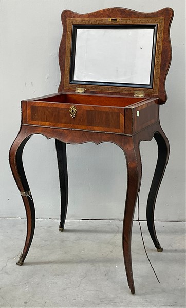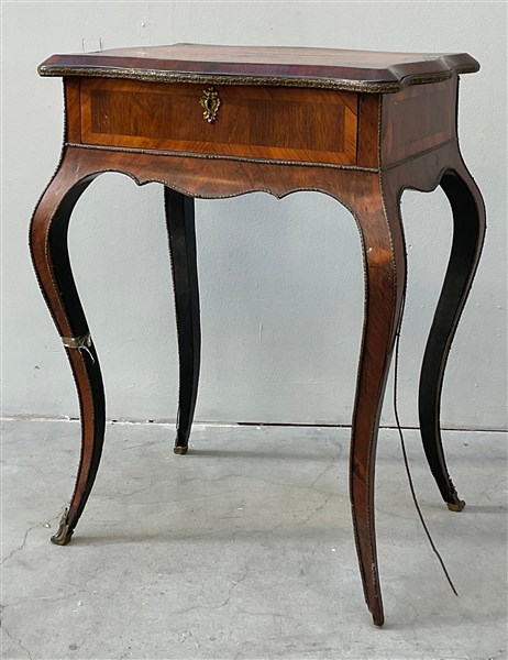 Tavolino da lavoro di forma mossa con piano intarsiato in legni vari a strumenti musicali, fiori e volute. Piano apribile a specchio con cassetto estraibile, gambe mosse profili e scarpette in metallo (cm 54x76x40) (difetti e mancanze)