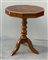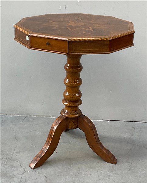Tavolo decagonale lastronato in noce, intarsiato e filettato, piano intarsiato in legni vari a volute e motivi a stella. Gamba centrale tornita terminante a tre piedi sagomati. Secolo XIX (cm 60x73x60) (difetti)