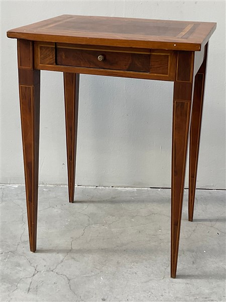 Tavolino a gamba alta con piano, fasce e gambe filettate in legni vari, cassetto sottopiano e gambe rastremate (cm 60x80x47) (difetti)