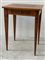 Tavolino a gamba alta con piano, fasce e gambe filettate in legni vari, cassett