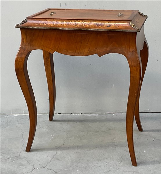 Tavolo fioriera lastronata e intarsiato a mazzi fiorit. Profili e fregi in metallo. Gambe mosse (cm 60x75x44) (difetti)