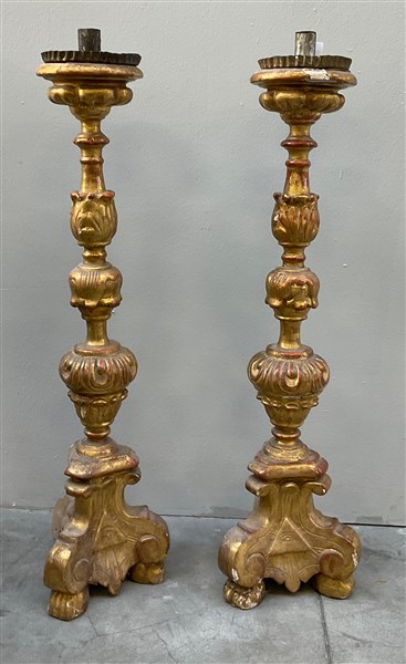 Coppia di torciere in legno intagliato e dorato, secolo XIX (h cm 67) (difetti e mancanze)