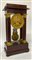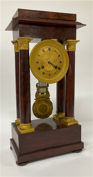 Pendola a portico in legno e bronzo dorato. Quadrante a decoro guilloché con numeri romani e lancette breguet. Movimento settimanale con suoneria delle ore e mezze su campanello. Francia, 1830 ca. (h cm 45) (difetti)