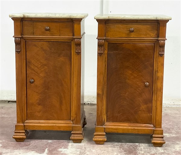 Coppia di comodini in noce ad un anta e un casseto lastronati in radica, pian in marmo bianco, Lombardia secolo XIX (cm 45x81x34) (difetti)