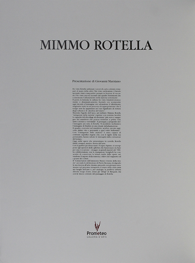 - MIMMO ROTELLA, "Primo futurismo", 2000, Serigrafia originale del maestro Mimmo Rotella stampata su carta Moulin du Gué da 320 gr, Dim. 60x80, Tiratura in cento esemplari da 1 a 100 più venti numeri romani, Stampa realizzata da Alberto Serighelli, Arte 3, Milano nel Settembre 2000, Opera appartenente al ciclo "Omaggio ai Grandi Maestri", Al verso: esemplare n° 61/100 in basso a sinistra, firmato in basso a destra, Opera senza cornice