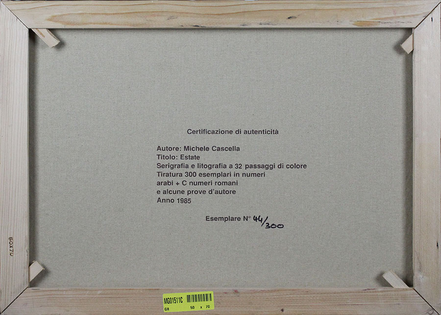 MICHELE CASCELLA, "Incontro", 1985, Serigrafia e litografia su tela, Dim. 50x70, Al verso: certificato di autenticità, descrizione con autore, titolo, tecnica, anno ed esemplare n° 209/300 , Al fronte: esemplare n° 209/300 in basso a sinistra e firmato in basso a destra, Solo telaio