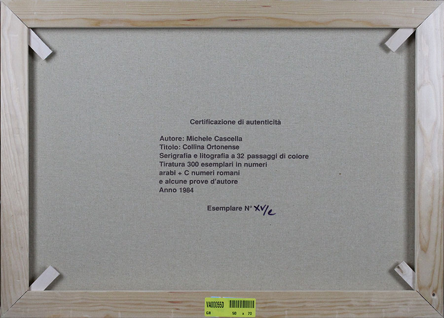 MICHELE CASCELLA, "Collina ortonense", 1984, Serigrafia e litografia su tela, Dim. 50x70, Al verso: certificato di autenticità, descrizione con autore, titolo, tecnica, anno ed esemplare n° XV/C , Al fronte: esemplare n° 230/300 in basso a sinistra e firmato in basso a destra, Solo telaio