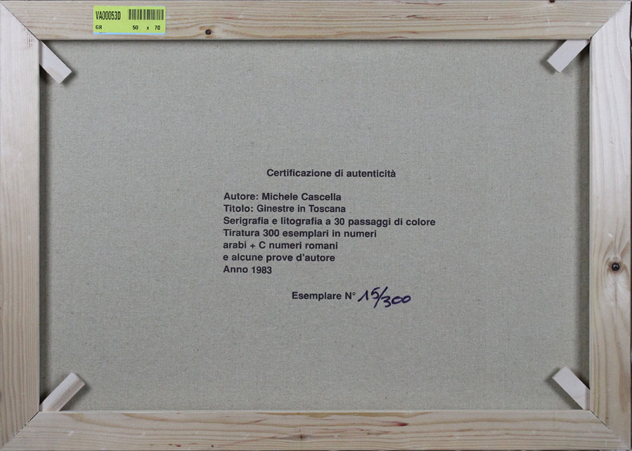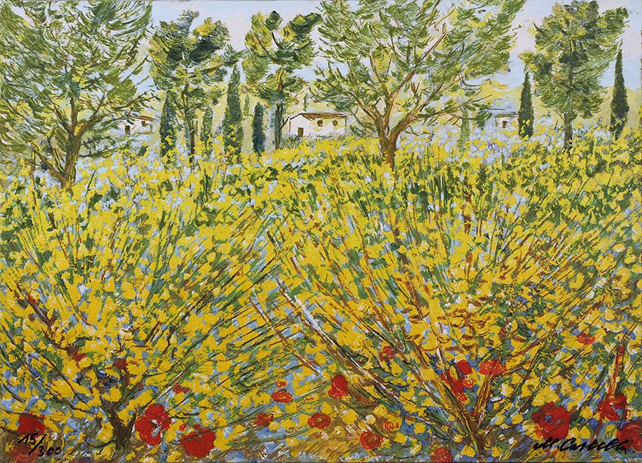 MICHELE CASCELLA, "Ginestre in Toscana", 1983, Serigrafia e litografia su tela, Dim. 50x70, Al verso: certificato di autenticità, descrizione con autore, titolo, tecnica, anno ed esemplare n° 15/300 , Al fronte: esemplare n° 15/300 in basso a sinistra e firmato in basso a destra, Solo telaio