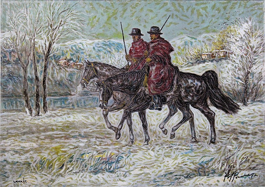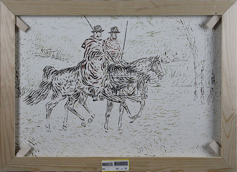 GIOVAN FRANCESCO GONZAGA, "Cavalieri gonzagheschi", Serigrafia su tela, Dim. 50x70, Al verso: timbro di Giovan Francesco Gonzaga e timbro con edizione MMVII "Arte", Al fronte: esemplare n° LXXX / C in basso a sinistra e firmato in basso a destra, Solo telaio