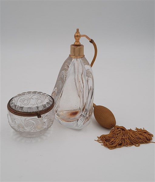 Lotto composto da una bottiglietta portaprofumo in vetro trasparente incolore e una bomboniera di Baccarat in vetro soffiato in stampo con ghiere in metallo, realizzato come souvenir per la visita della Tour Eiffel con data 25 marzo 1895. (bottiglietta: h cm 19; bomboniera: d cm 8) (lievi difetti)