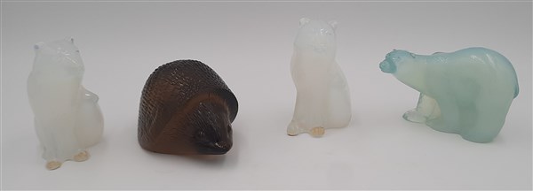 Lotto composto da una scultura in vetro raffigurante un riccio, due lupi e un orso. Anni '70/'80. (h max cm 12)