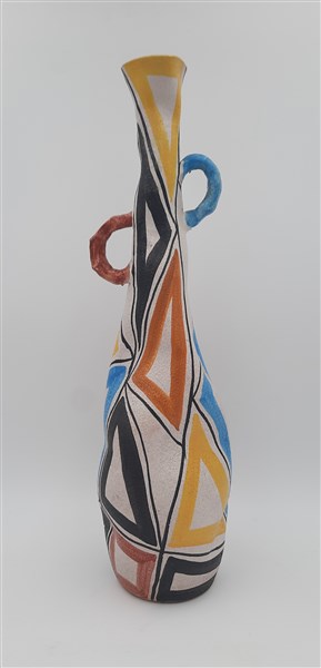 Bottiglia biansata a corpo irregolare. Albisola, seconda metà secolo XX. Gres decorato con figure geometriche in rosso, arancione, giallo, nero e azzurro su fondo bianco opaco. Firmata sotto la base. (h cm 47) (restauri)