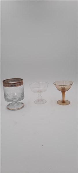 Lotto composto da un calice in vetro pagliesco, un calice in vetro cristallo con decori incisi e bordo dorato e un calice in vetro cristallo con orlo lattimo. Secolo XX. (h max cm 16) (lievi difetti)